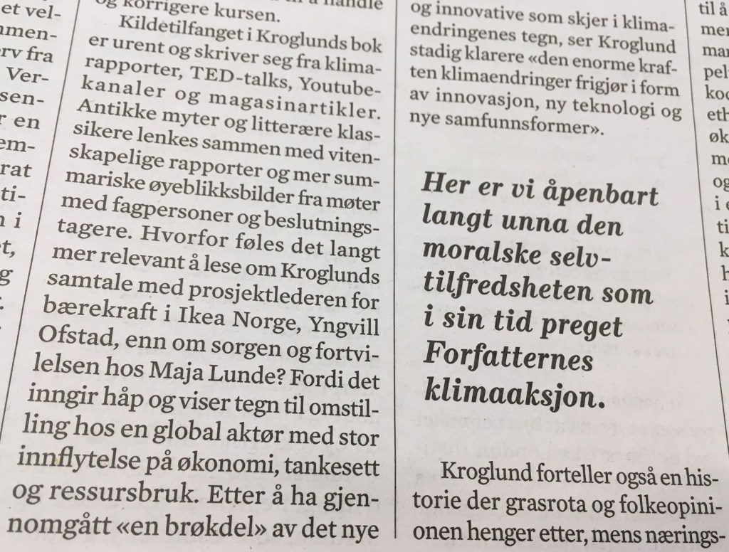 Ved olsoktider anmeldte jeg sakprosaboken Termostat. Hvordan klimaet former oss, forandrer samfunnet og forvandler fremtiden, forfattet av Andrew P. Kroglund, for avisen Vårt Land. Som anmelder var jeg velvillig innstilt til både mangfoldet av innfallsvinkler og den dialogiske formen, men jeg var samtidig usikker på hvilken holdning forfatteren hadde til sitt emne (Vårt Land, 29. juli 2020).
