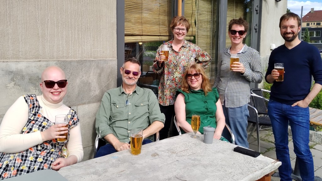 Petrokritikere slapper av i sola etter arbeidsseminaret Petrocultures Across Regions 14. juni 2022. Fra venstre: Tomine Sandal, Graeme Macdonald (gjesteforeleser), Julia Leyda, Sissel Furuseth, Katie Ritson og Reinhard Hennig. Foto: Ursula Münster.